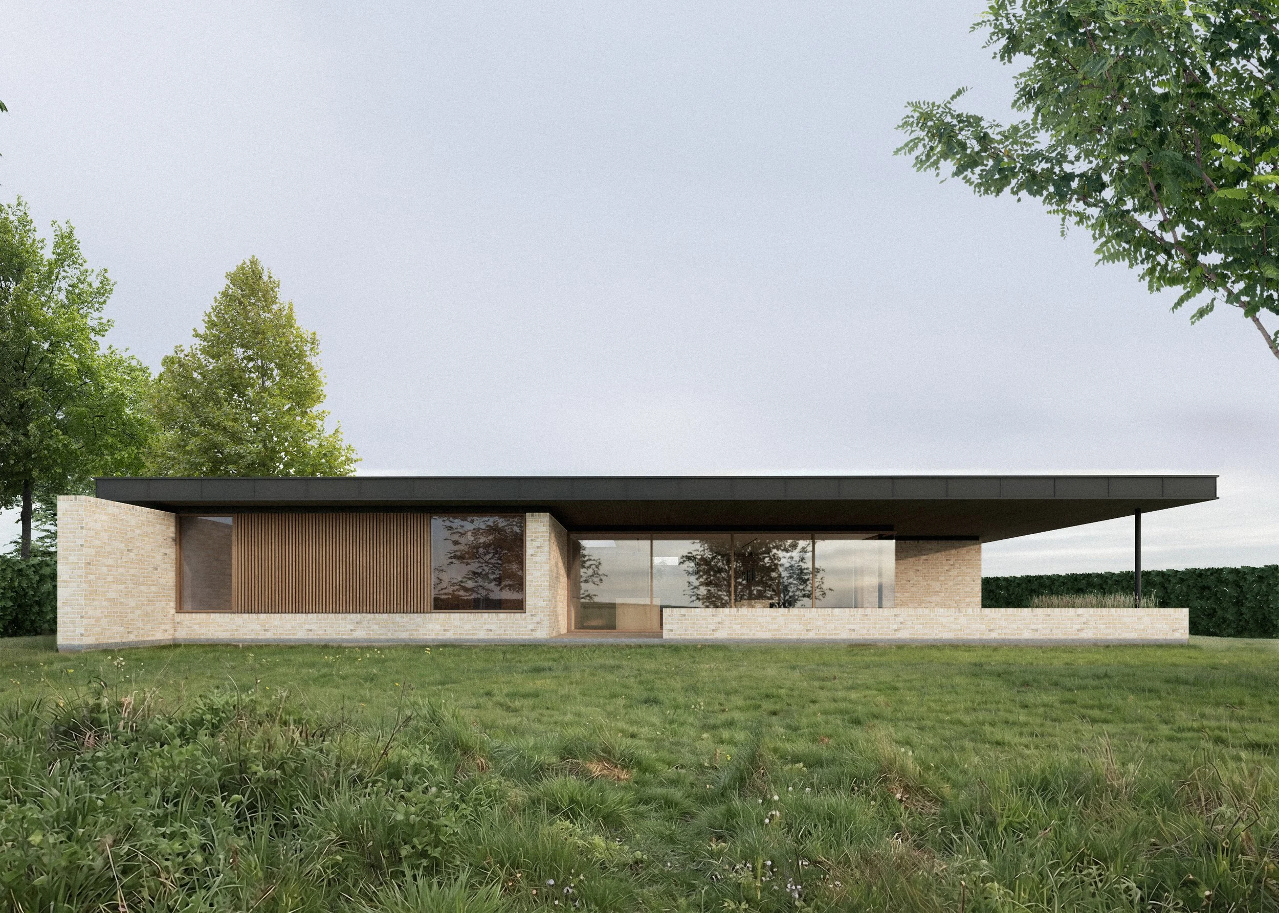 Inspireret af 70’ernes arkitektur, hvor teglskiver og den markante tagskive er med til at definere det overordnede greb og skabe en rolig, horisontal fremtoning.
