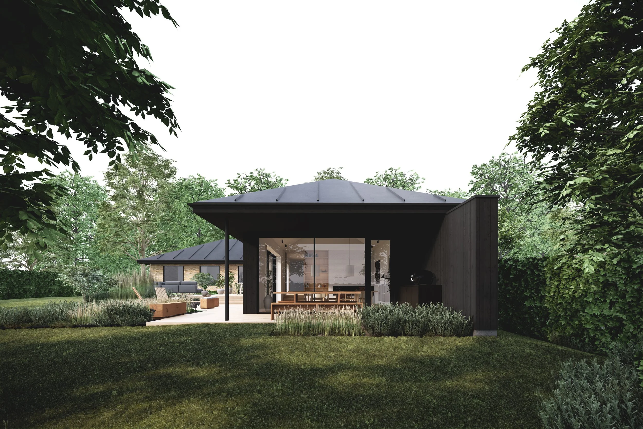 Der etableres en tæt forbindelse til haven og en overdækket terrasse med udekøkken, hvor overgangen mellem inde og ude bliver en integreret del af arkitekturen. Samlet fremstår tilbygningen som et nutidigt lag, der understøtter den eksisterende villas arkitektur.