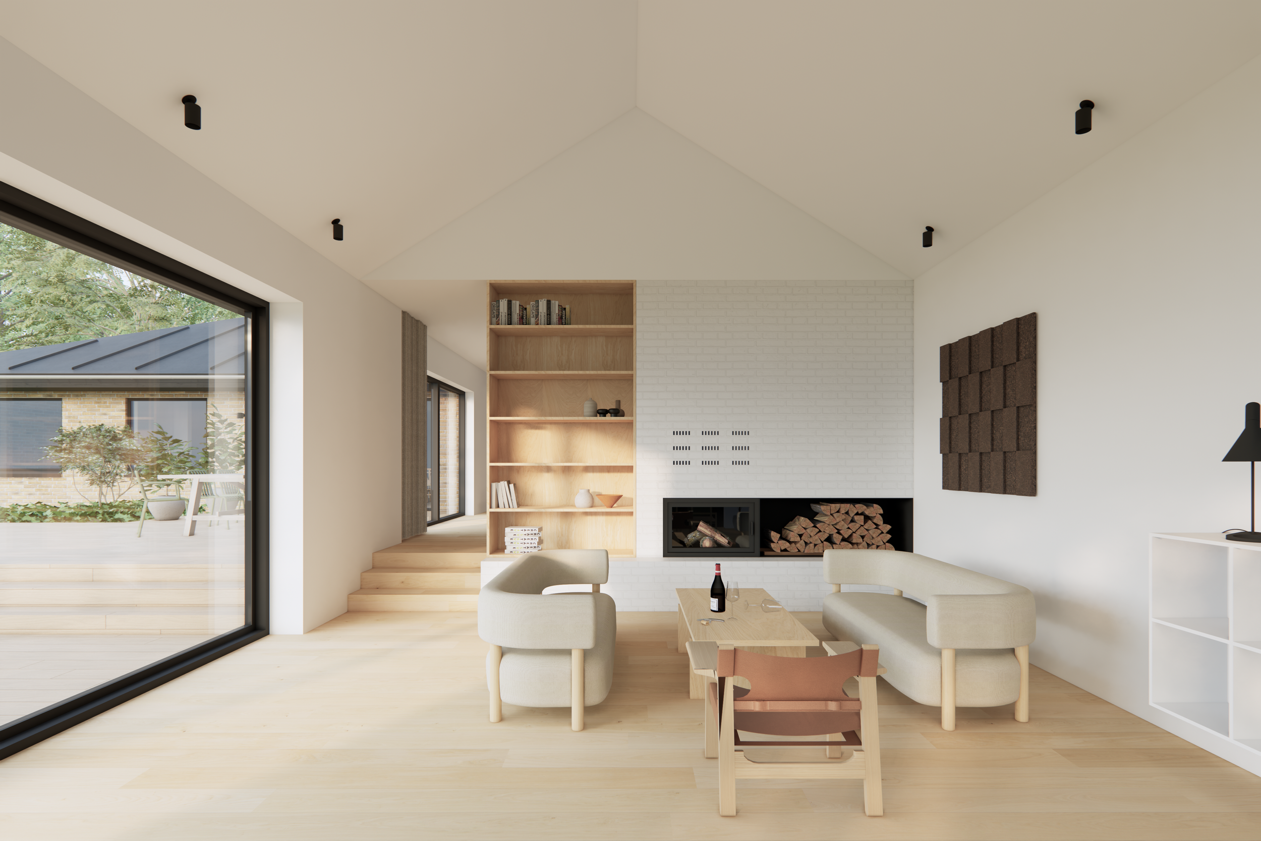 Med et areal på ca. 45 m² udvider tilbygningen den eksisterende stue og tilfører et nyt opholdsrum med plads til både fællesskab og fordybelse omkring en indbygget pejs.
